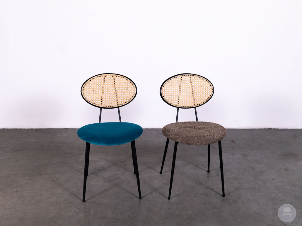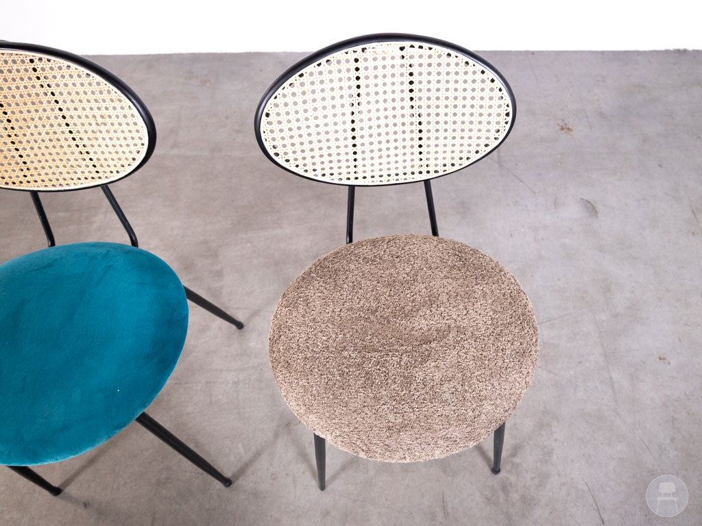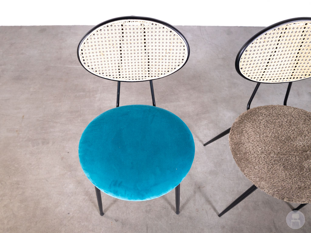 1 set 2 stuks Horecastoel Celeste SC mix Satelliet is een stijlvolle horecastoel met een speelse mix van materialen en kleuren. Deze stoelen zijn uitgevoerd met een slank metalen frame in zwart, gecombineerd met een rotan rugleuning en twee verschillende zittingen: één in opvallend blauw en één in een warme bruine stof.