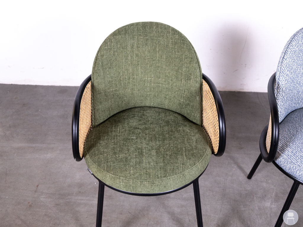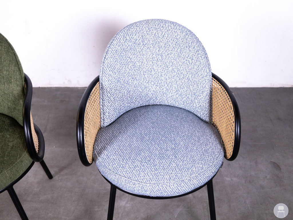 1 set 2 stuks Horecastoel Evora AC blauw groen Satelliet combineert elegantie met comfort in een opvallend en stijlvol ontwerp. De stoelen hebben een prachtige retro-uitstraling, dankzij de combinatie van ronde vormen, een zwart metalen frame, geweven rotan zijpanelen en een zachte bekleding in twee verschillende kleuren: één in groen en één in blauw.
