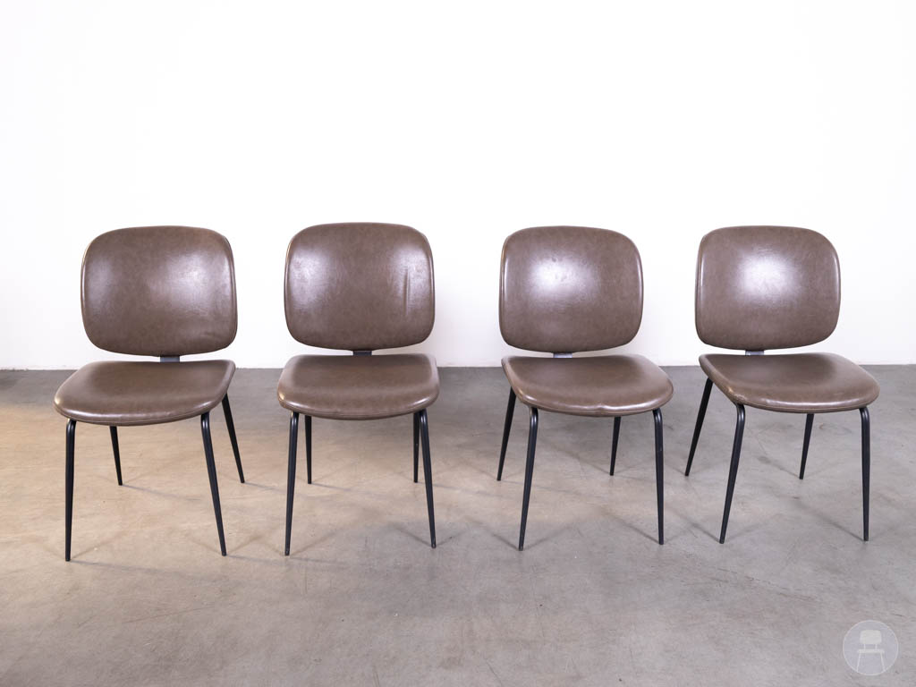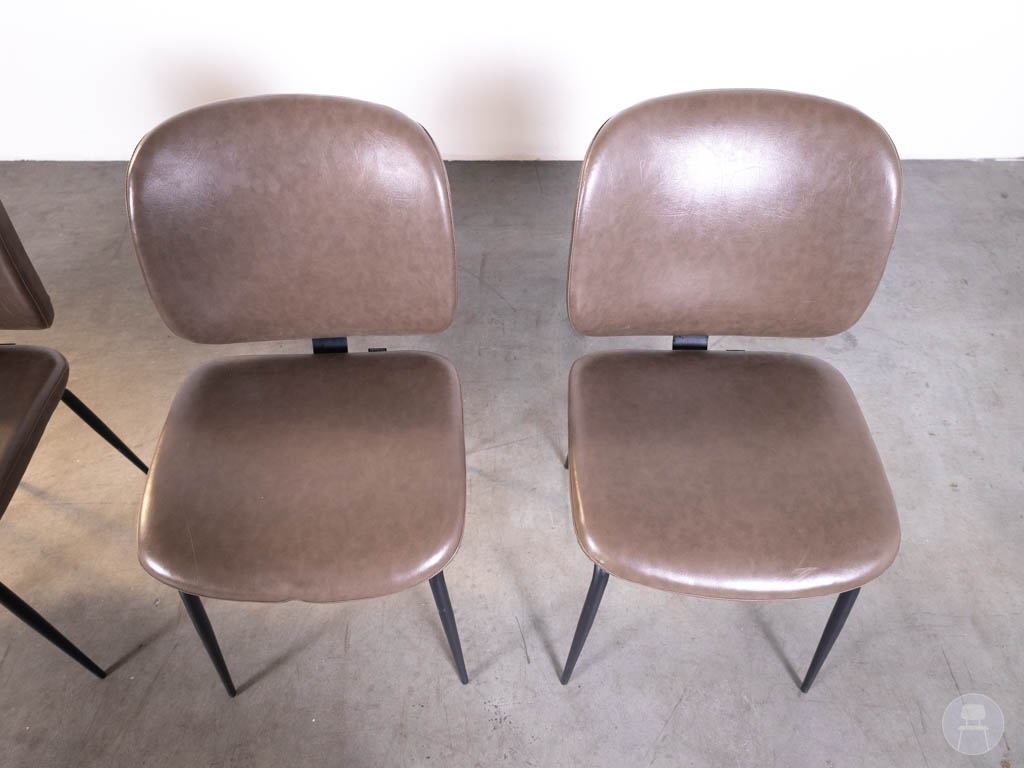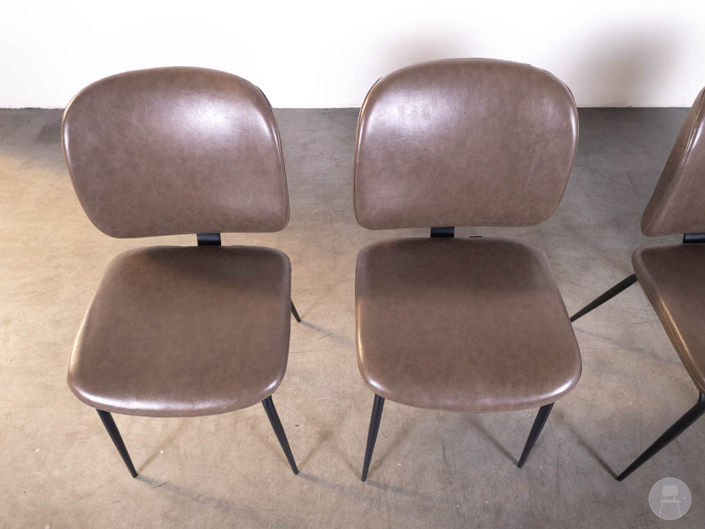 De stoelen zijn uitgevoerd in een donkerbruine bekleding met een luxe leerlook, wat zorgt voor een elegante en tijdloze uitstraling. Het slanke metalen frame in zwart geeft de stoel een moderne touch en zorgt tegelijkertijd voor stevigheid en duurzaamheid bij intensief gebruik. Deze horecastoelen zijn van het merk Satelliet, een toonaangevend merk binnen de horeca dat bekend staat om zijn hoogwaardige kwaliteit, duurzaamheid en zitcomfort.