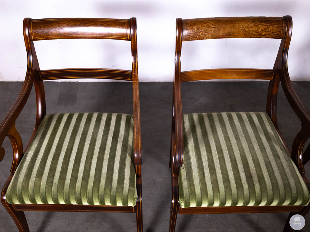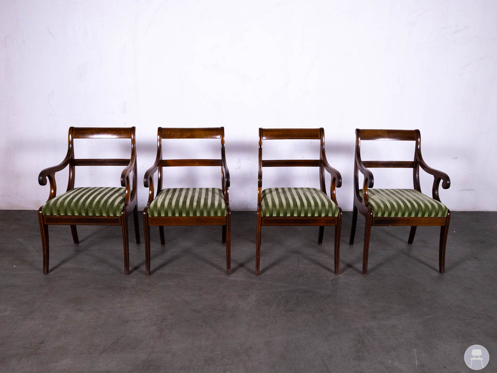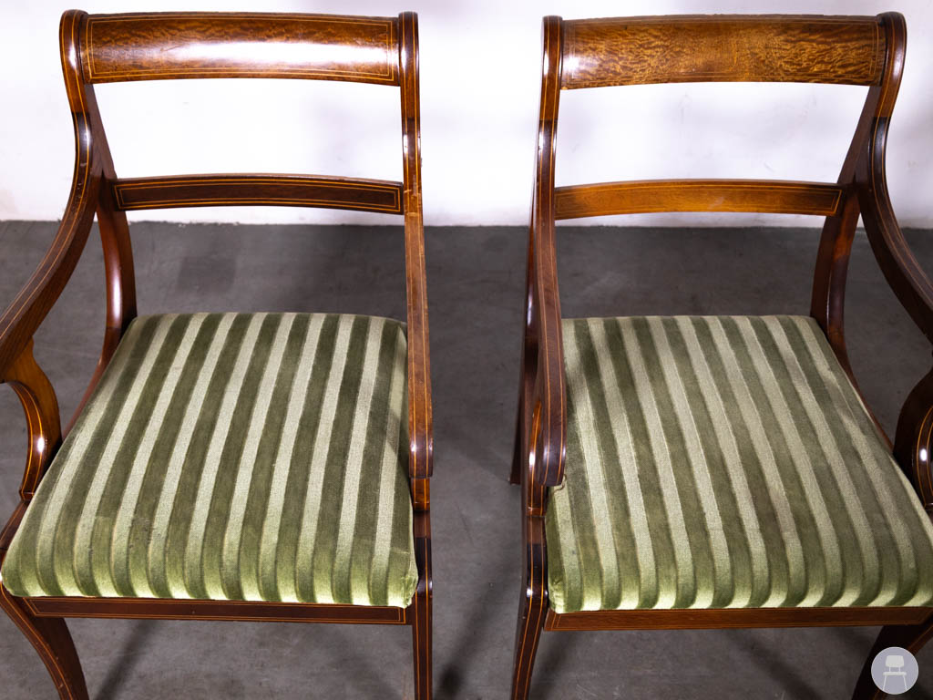 De combinatie van het gebogen houten frame met armleuningen en de groen gestreepte stof geeft deze stoelen een klassieke en tijdloze uitstraling. Hierdoor passen ze perfect in een restaurant, café, hotel of klassiek horeca-interieur. De sierlijke vormen van het hout zorgen bovendien voor een luxe en karaktervolle uitstraling.
