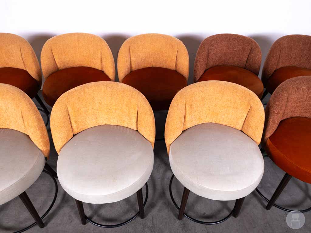1 set 9 stuks Horecastoel Lux MS oranje mix Satelliet is pure warmte en sfeer in één oogopslag! Met hun rijke velvet zittingen in levendig oranje en zacht lichtgrijs straalt elke stoel comfort en stijl uit. De rugleuningen zijn bekleed met gemêleerde oranje stoffen die variëren van abrikoos tot roestbruin – een prachtige kleurencombinatie die meteen karakter geeft aan elke ruimte. Voeg daarbij het stevige houten onderstel en de elegante zwarte stalen voetring, en je hebt een stoel die net zo functioneel is als hij mooi is.