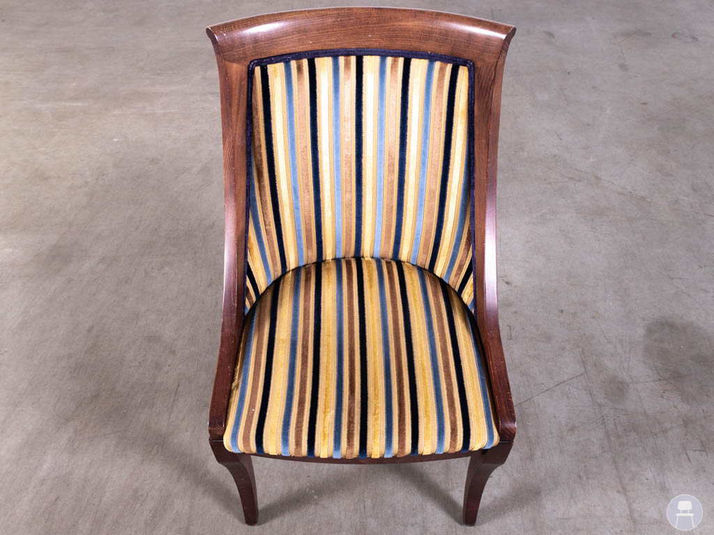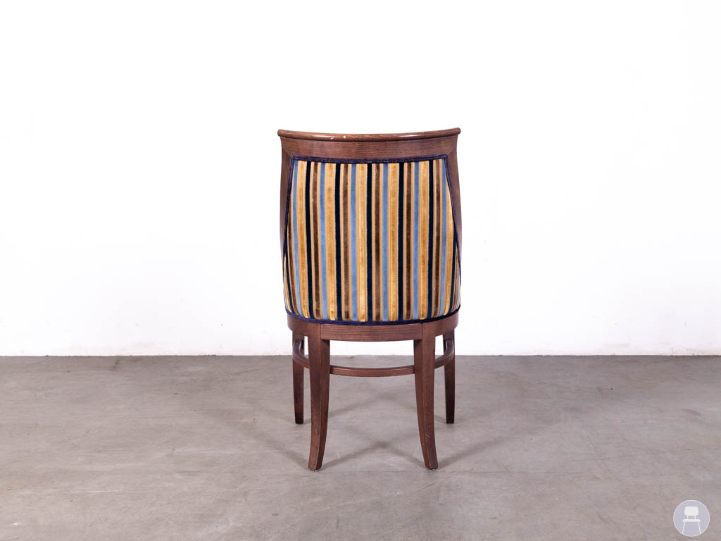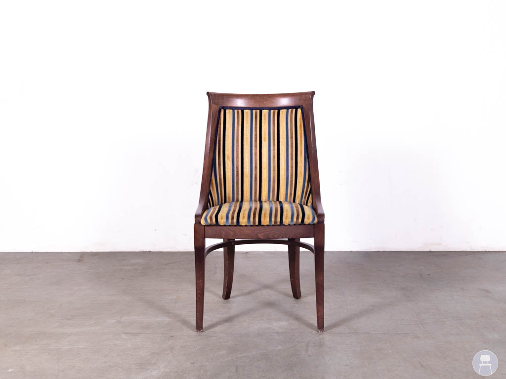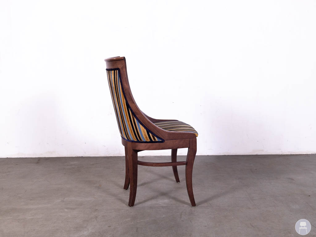 De stoel is uitgevoerd met een massief houten frame in een warme, donkerbruine tint en een gestoffeerde zitting en rugleuning met meerkleurig streeppatroon. De combinatie van kleuren geeft de stoel een levendige en elegante uitstraling, terwijl de gebogen rugleuning zorgt voor een comfortabele zit.