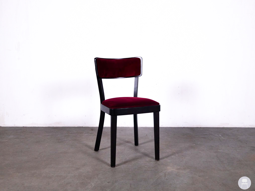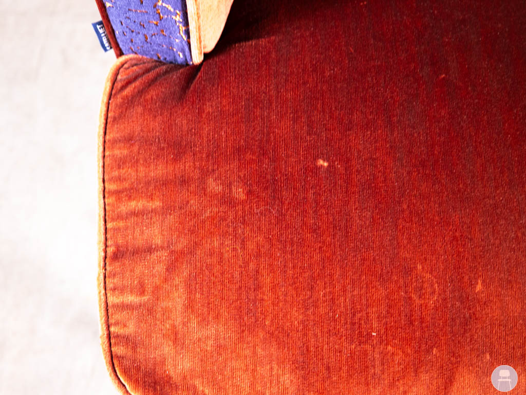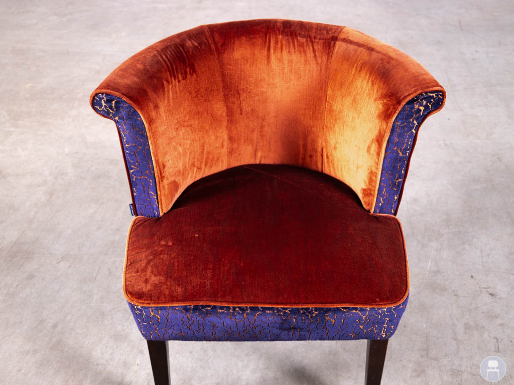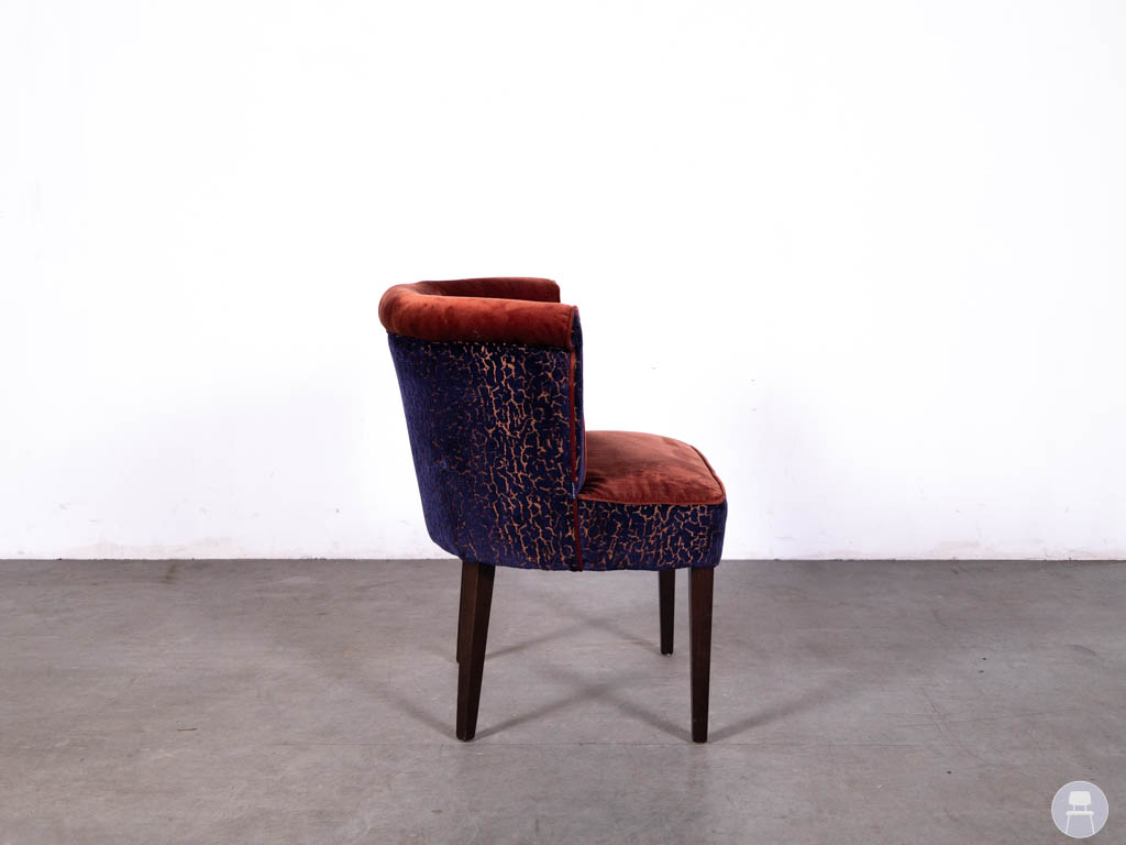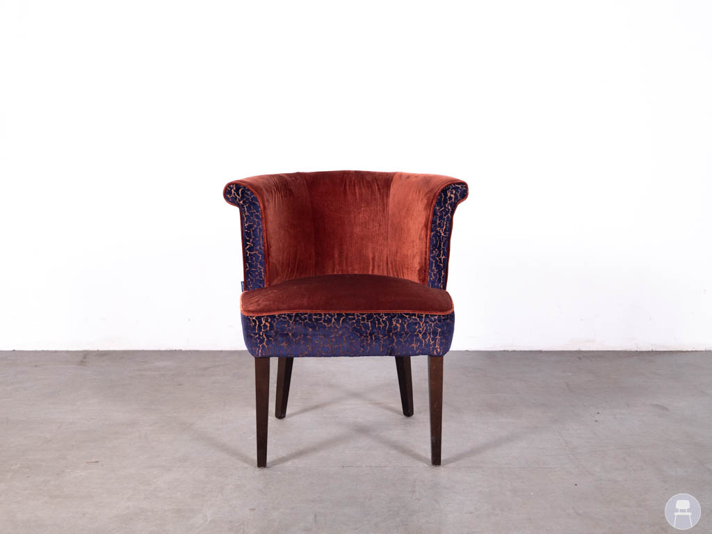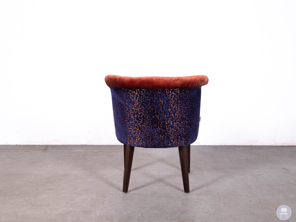 De zitting is bekleed met zachte velvet stof in een warme rode kleur, wat zorgt voor een rijke en chique uitstraling. De buitenzijde van de stoel is afgewerkt met een opvallende blauw/paarse print, wat deze stoel een speels en exclusief karakter geeft. Deze combinatie van velours en print sluit perfect aan bij de huidige trends in de horeca.