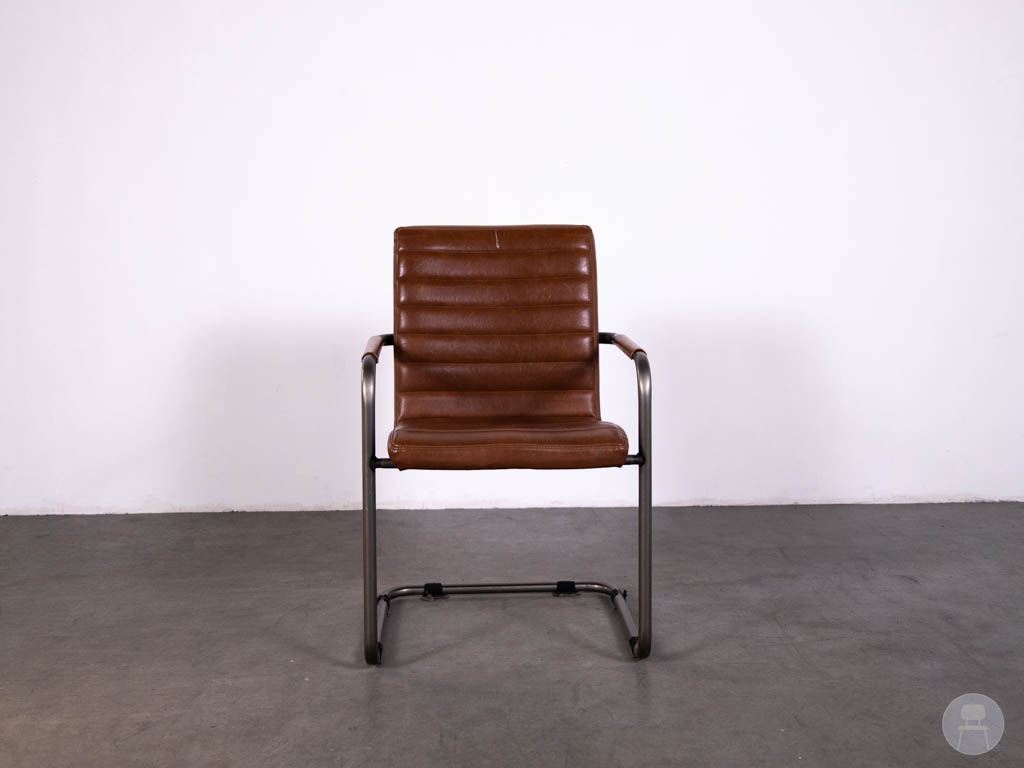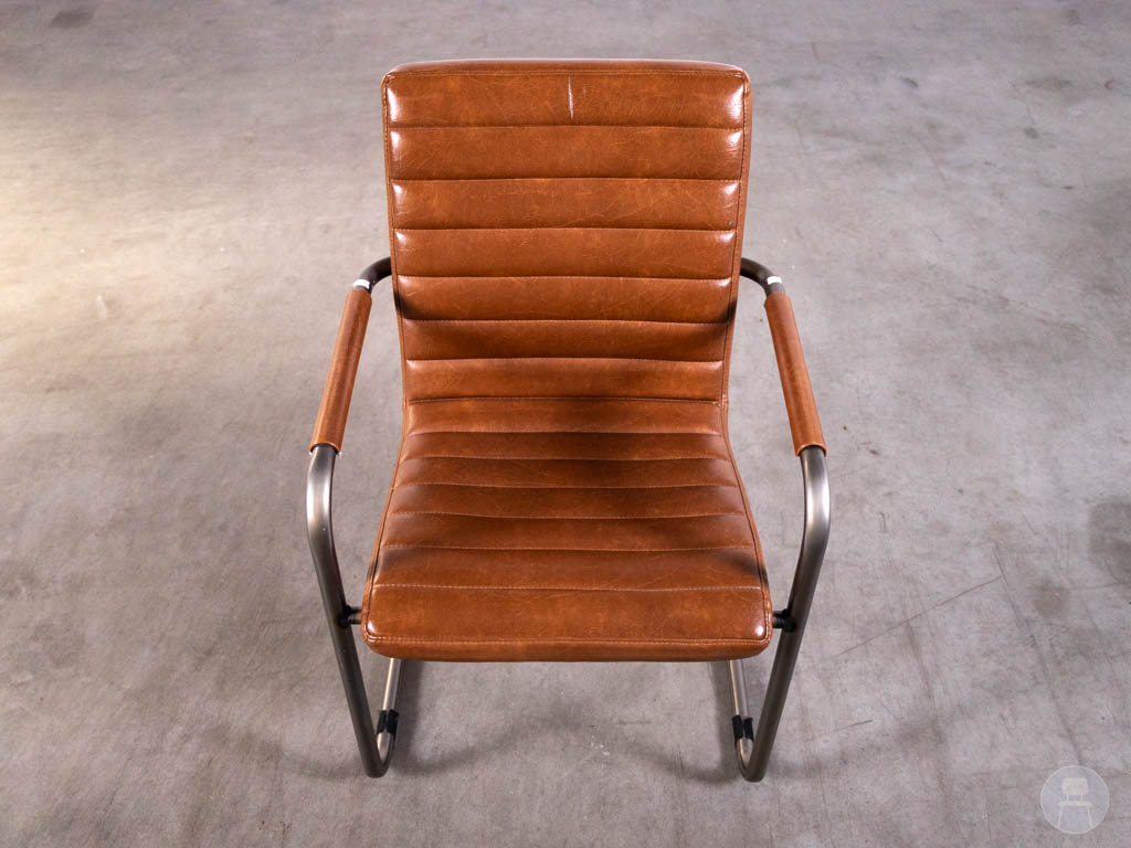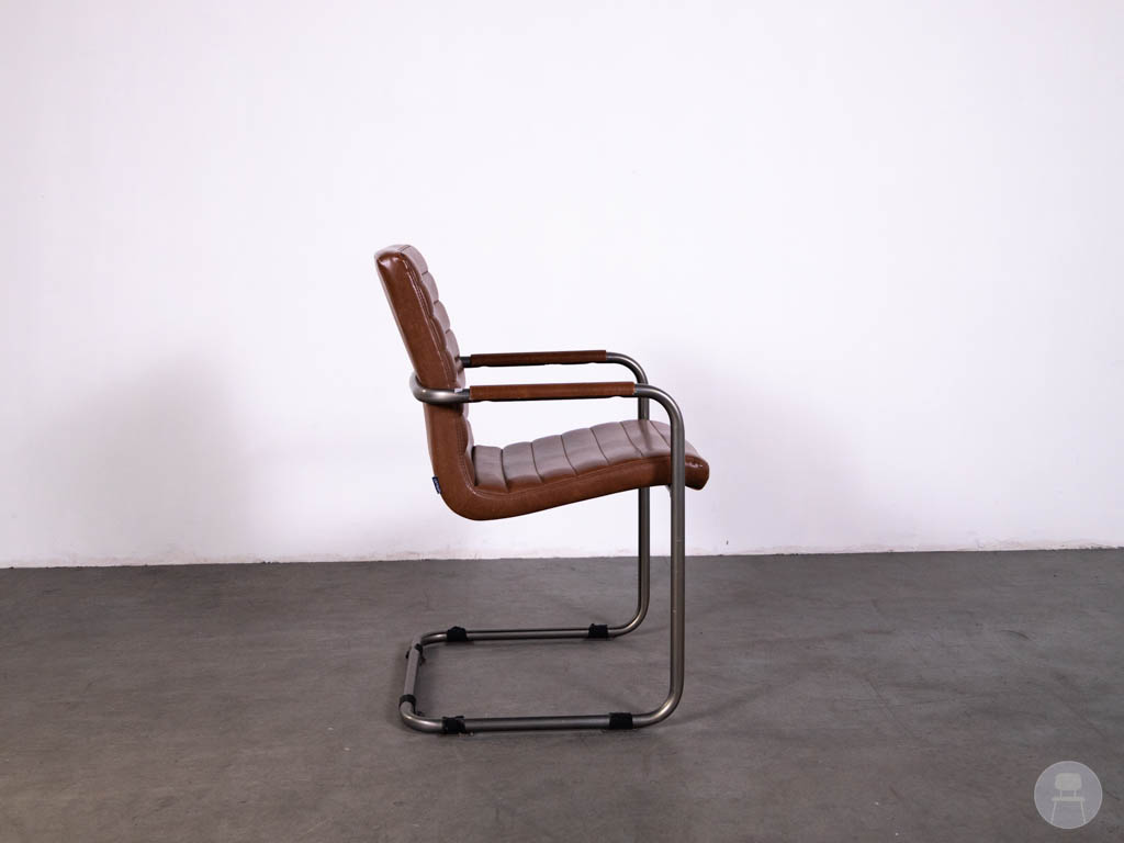 De stoel is uitgevoerd in een rood/bruine bekleding met een luxe leerlook en horizontale stiknaden, wat zorgt voor een stoere en moderne uitstraling. Het sledeframe van metaal geeft de stoel een strak design en biedt tegelijkertijd stevigheid en stabiliteit bij intensief gebruik. De armleuningen met houten accenten zorgen voor extra comfort en een warme touch.