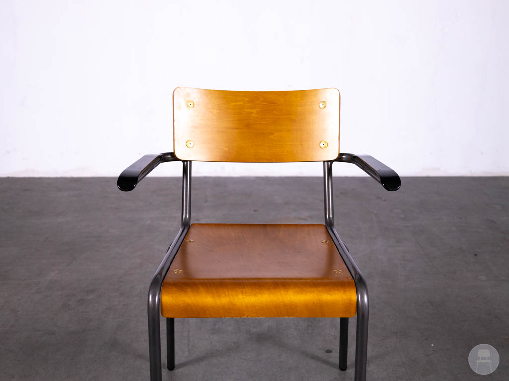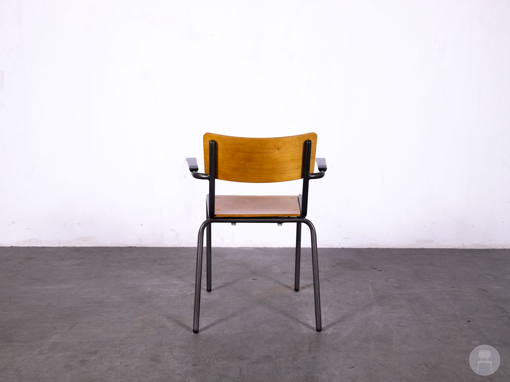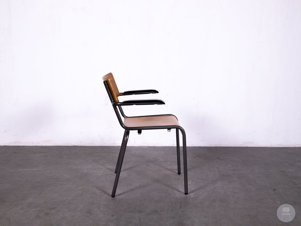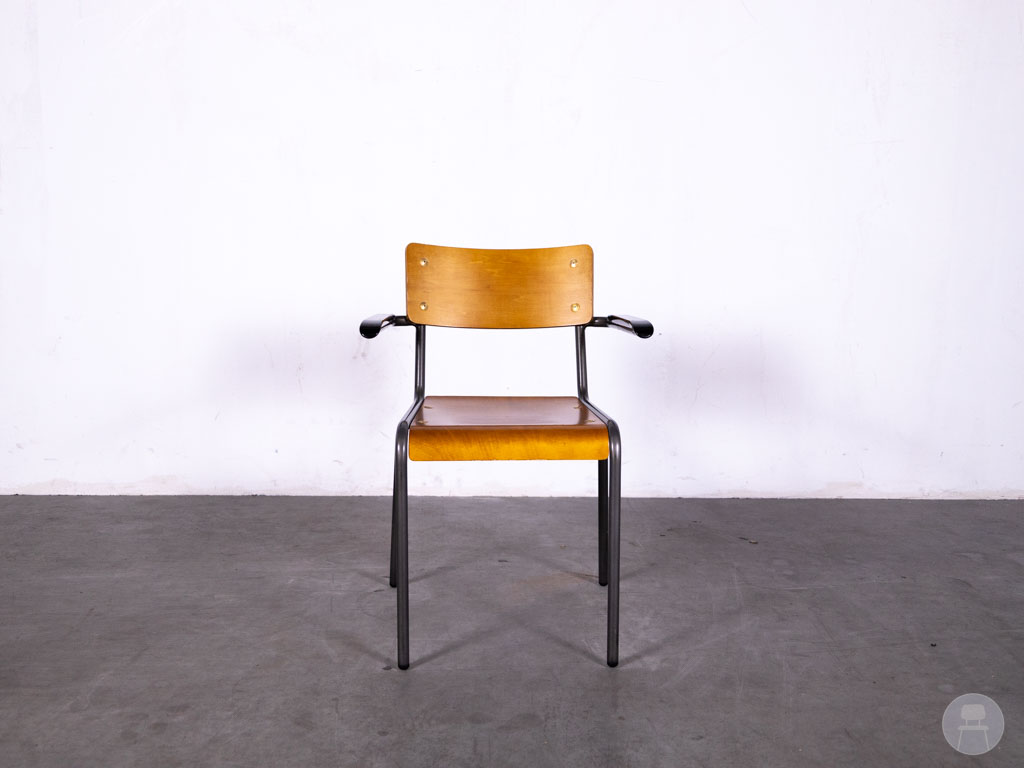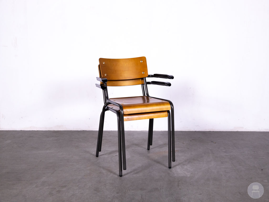 Schoolstoel Student AC Fien Satelliet is een klassieker met een industriële twist die perfect inzetbaar is in zowel horecazaken als creatieve werk- of vergaderruimtes. Deze stoel combineert een stevig stalen onderstel met een gevormde houten zitting en rugleuning, wat zorgt voor zitcomfort en een warme, vintage uitstraling. De armleuningen bieden extra ondersteuning, wat deze stoel net dat beetje extra comfort geeft bij langer gebruik.