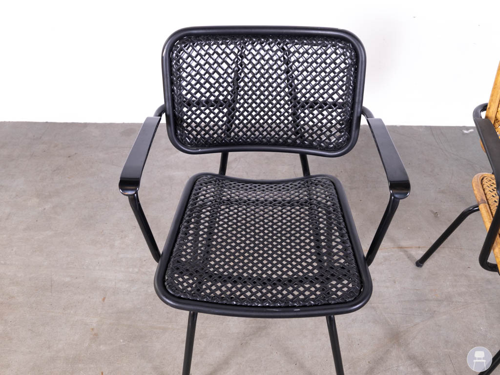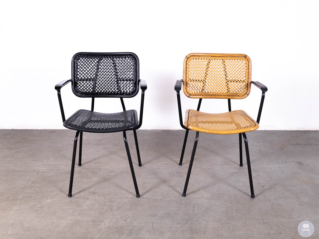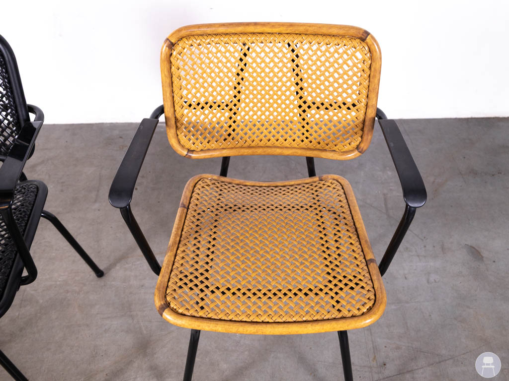 De stoelen zijn voorzien van een stevig metalen frame met een gevlochten zitting en rugleuning, wat zorgt voor een luchtige uitstraling en comfortabel zitcomfort. De armleuningen bieden extra ondersteuning, waardoor deze stoelen ideaal zijn voor langdurig gebruik in een horeca- of terrasomgeving.