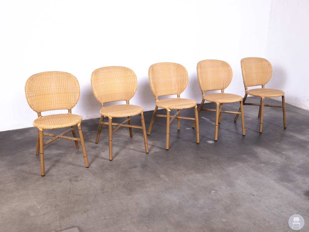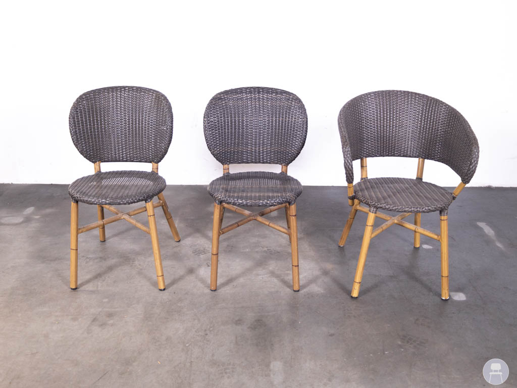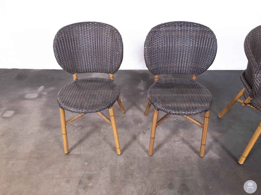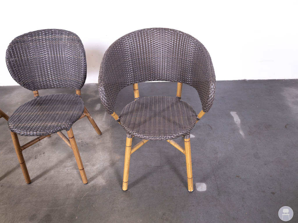De stoelen zijn uitgevoerd in antracietkleurig wicker, wat zorgt voor een moderne en veelzijdige uitstraling. Het gevlochten wicker geeft de stoel een verfijnde look, terwijl het stevige frame stabiliteit biedt en geschikt is voor intensief horecagebruik. De combinatie van het donkere vlechtwerk met het onderstel in bamboelook zorgt voor een warme, natuurlijke uitstraling.