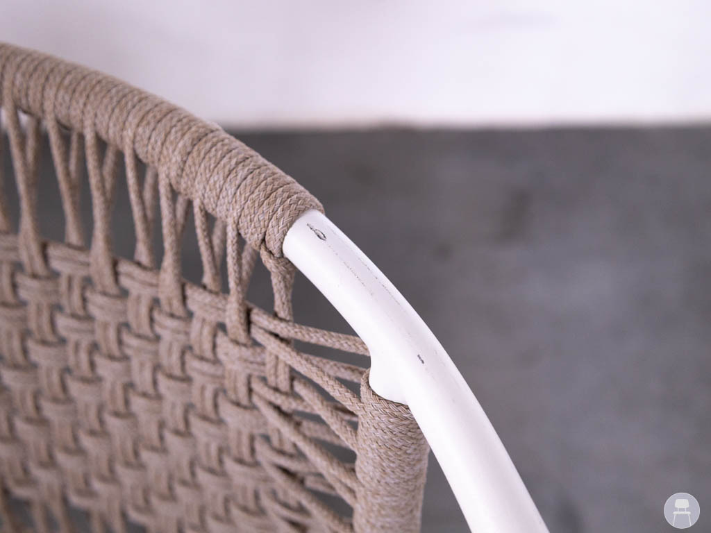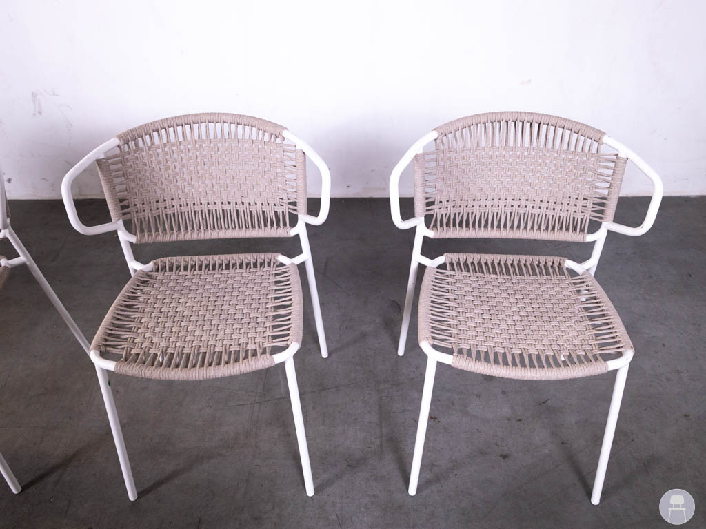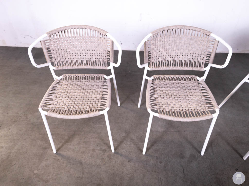 1 set 4 stuks Terrasstoel Vic SC wit/zand Satelliet is een moderne en frisse set buitenstoelen, perfect voor horecaterrassen, strandpaviljoens of buitenlounges. De stoelen combineren een wit metalen frame met gevlochten zittingen en rugleuningen in een stijlvolle zandkleur, wat zorgt voor een lichte en zomerse uitstraling.