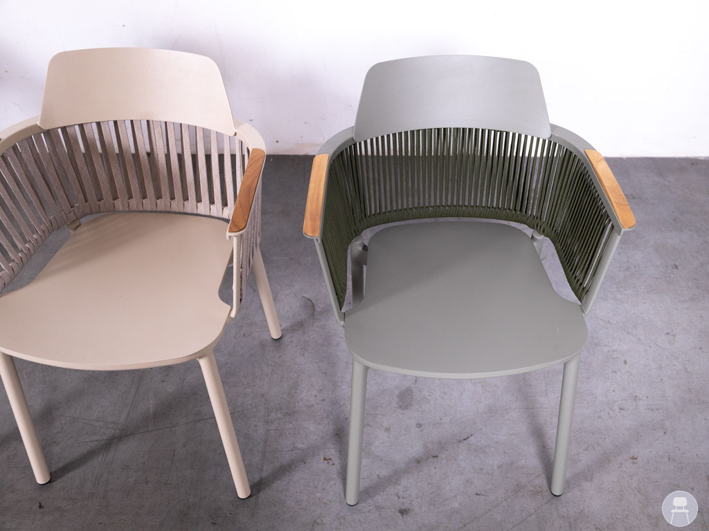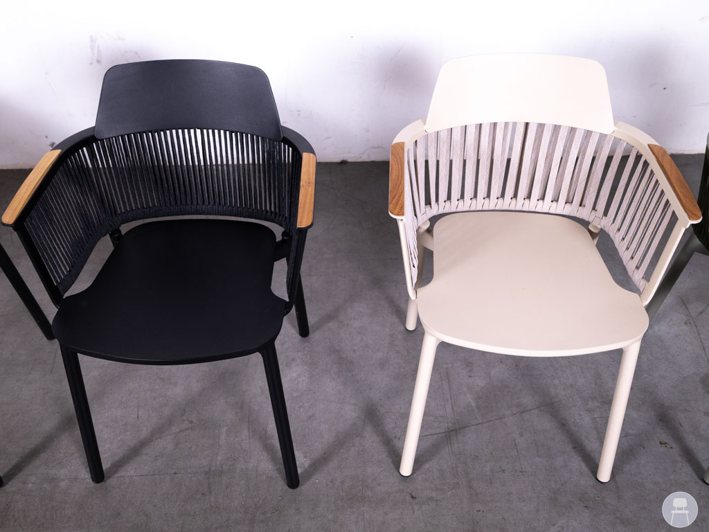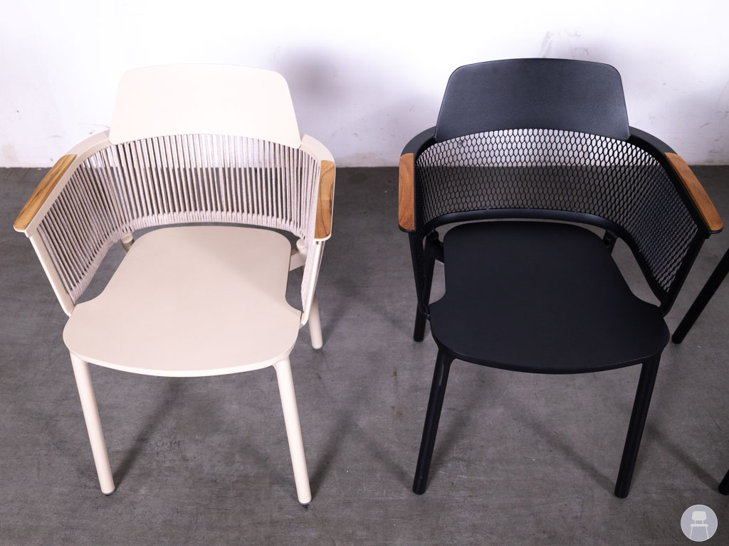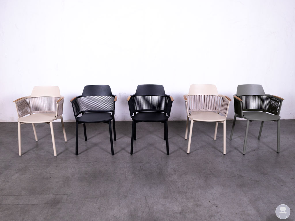 Elke stoel in deze mix heeft een eigen karakter, variërend van natuurlijke beige- en groentinten tot strak zwart, met een combinatie van kunststof zittingen en rugleuningen in opengewerkte of touwbespannen varianten. De armleuningen zijn afgewerkt met houtaccenten, wat zorgt voor een warme en luxe uitstraling. Deze combinatie van materialen en kleuren maakt de set van Satelliet perfect voor ondernemers die hun terras een speelse, maar stijlvolle look willen geven.