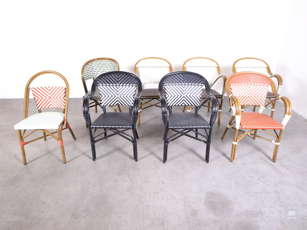 1 set 8 stuks Terrasstoel Cannes mix Satelliet is een stijlvolle en kleurrijke set terrasstoelen met een klassieke Franse bistro-uitstraling. De stoelen zijn uitgevoerd in een mix van kleuren en patronen, met een stevig frame van aluminium en een zitting en rugleuning van kunststof vlechtwerk.