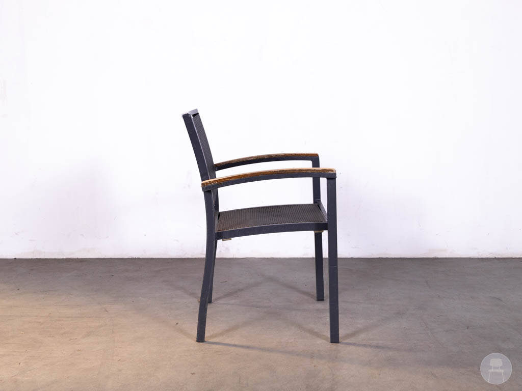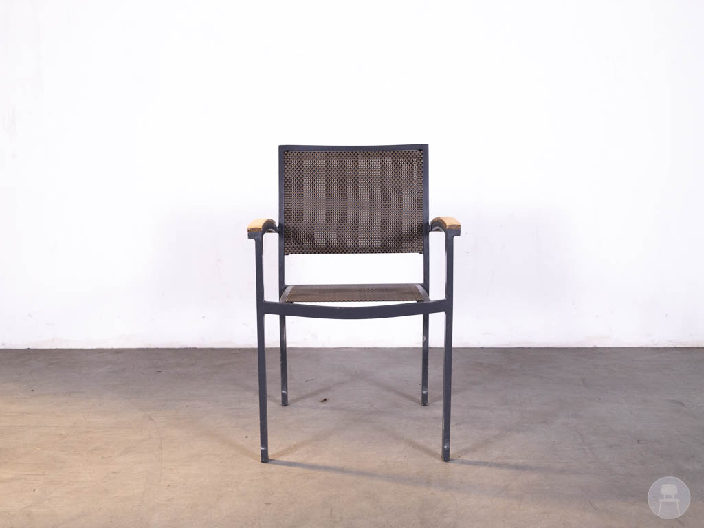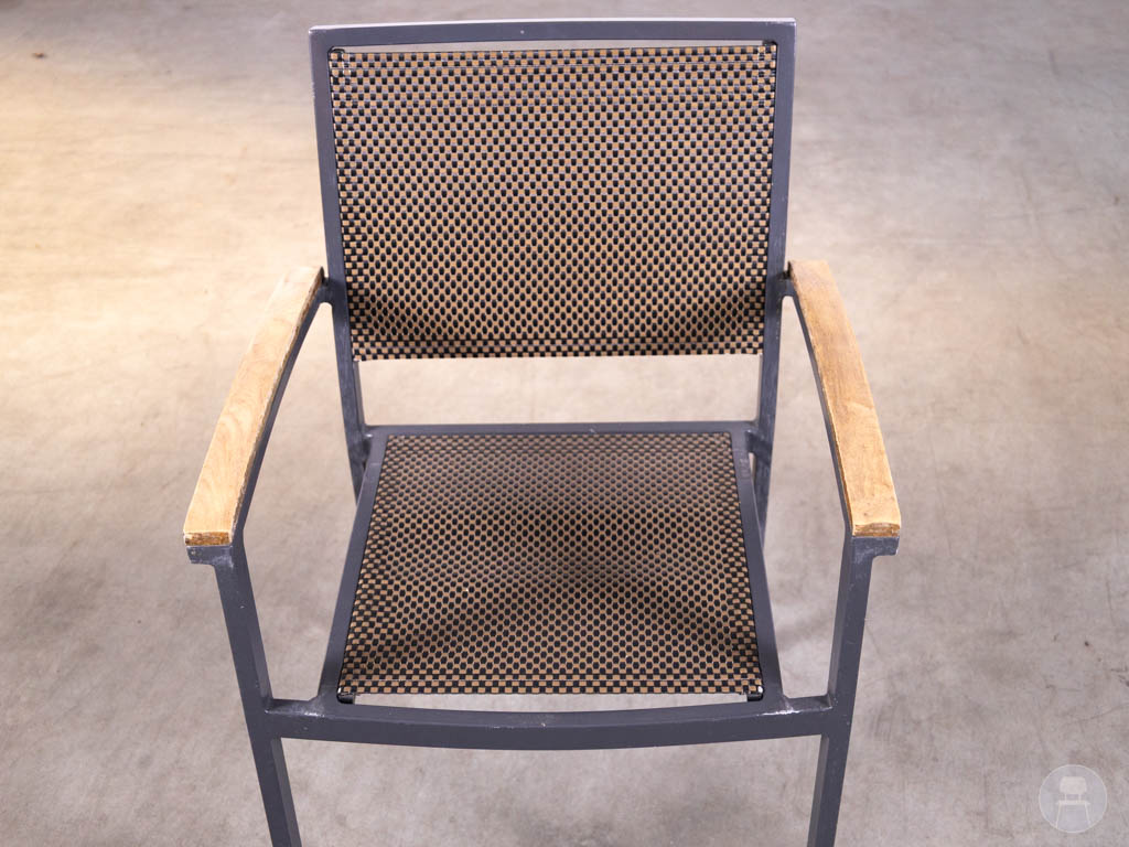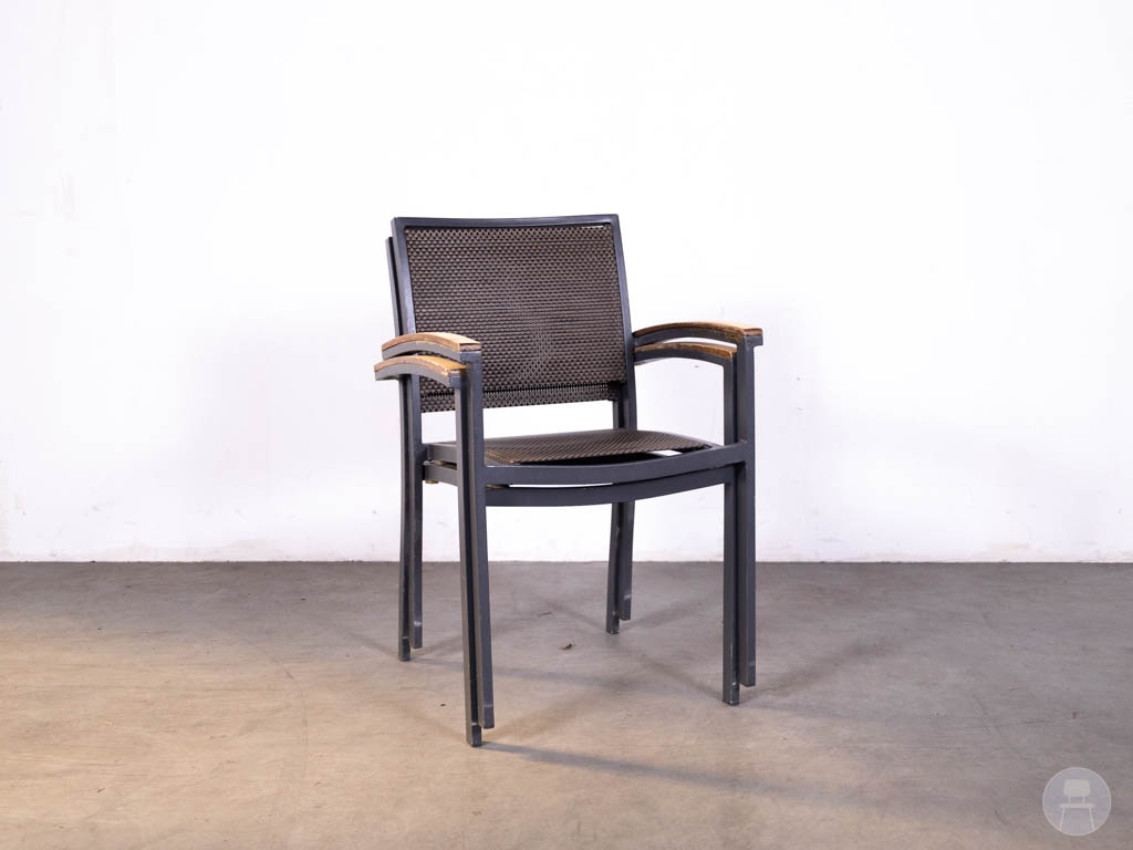 De zitting en rugleuning zijn gemaakt van Batyline, een sterk en weerbestendig materiaal dat zorgt voor een comfortabele zit en eenvoudig onderhoud. Het frame van aluminium in zwart met bruine accenten op de armleuningen geeft de stoel een stevige basis en een warme uitstraling.