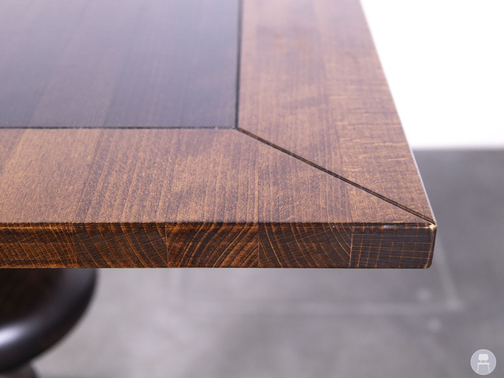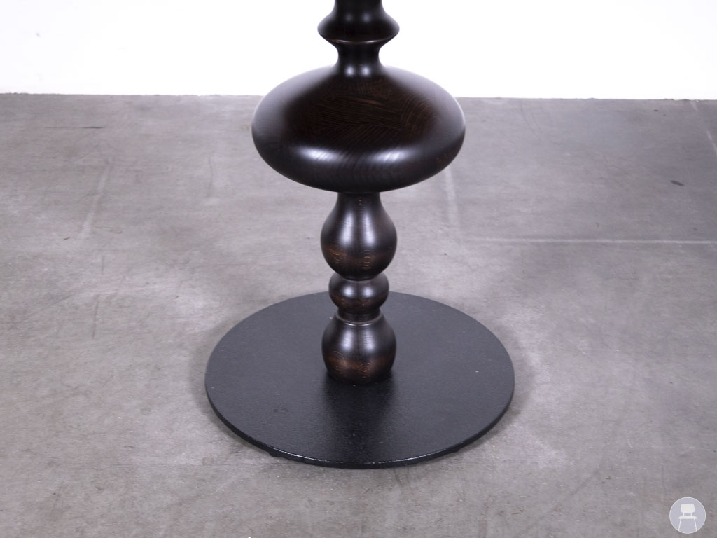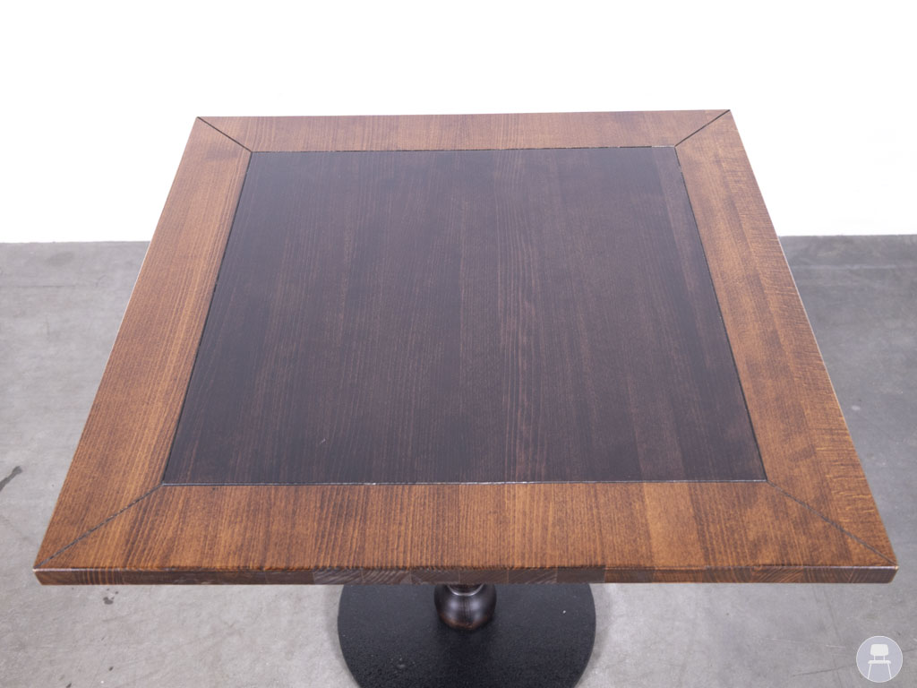 Horecatafel Manuel eiken licht bubbel Satelliet 80x80cm combineert een klassieke uitstraling met moderne stabiliteit. Het vierkante tafelblad van 80×80 cm is uitgevoerd in licht- tot donkerbruin eikenhout, met een elegante omlijsting rondom het blad die het houtwerk mooi accentueert. De eyecatcher van deze tafel is de sierlijke gedraaide ‘bubbel’ middenpoot, uitgevoerd in donker hout, die rust op een stevige ronde metalen voetplaat. Dit zorgt niet alleen voor een goede balans, maar ook voor voldoende beenruimte rondom de tafel. Ideaal voor gebruik in restaurants, cafés of hotellounges. De eiken afwerking en warme houttinten geven de horecatafel een tijdloze charme, terwijl het design zich uitstekend leent voor zowel klassieke als eigentijdse horeca-inrichtingen. Een uitstekende keuze voor wie op zoek is naar tweedehands horecatafels met karakter, kwaliteit en een bijzondere uitstraling.