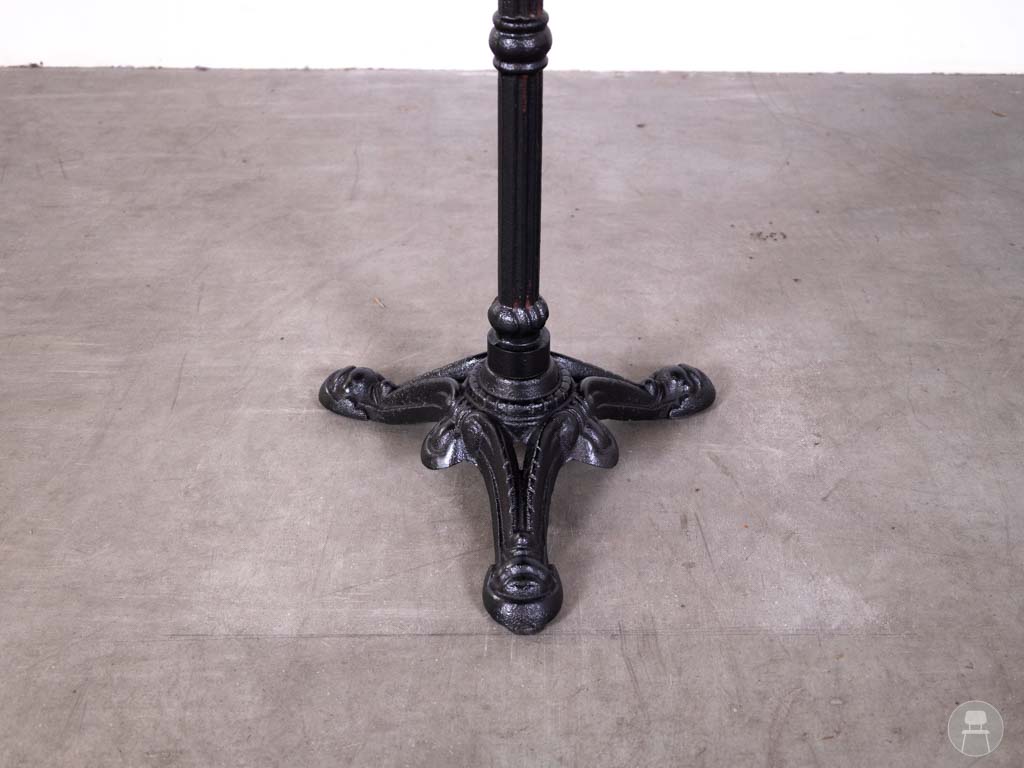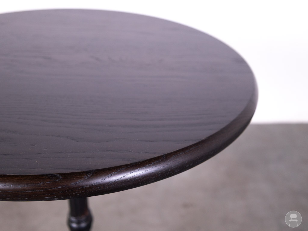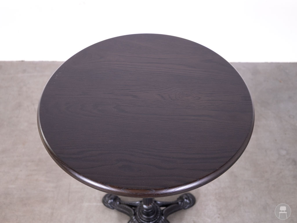 Horecatafel Rondo eiken bruin Satelliet 60cm rond is een elegante en compacte tafel die perfect past in klassieke of sfeervolle horecaconcepten. Deze ronde tafel heeft een diameter van 60cm en is voorzien van een donkerbruin eikenhouten blad met een subtiele houtnerf, wat zorgt voor een warme en luxe uitstraling. De fraaie, afgeronde randafwerking geeft de tafel een verfijnde look en maakt hem comfortabel in gebruik. Het zwarte gietijzeren onderstel met sierlijke details zorgt voor een stabiele basis en een tijdloos karakter. Deze tweedehands horecatafel is ideaal voor cafés, brasserieën en restaurants met een intieme setting.