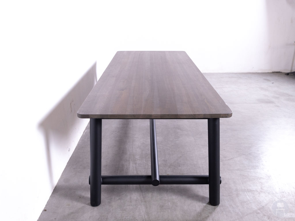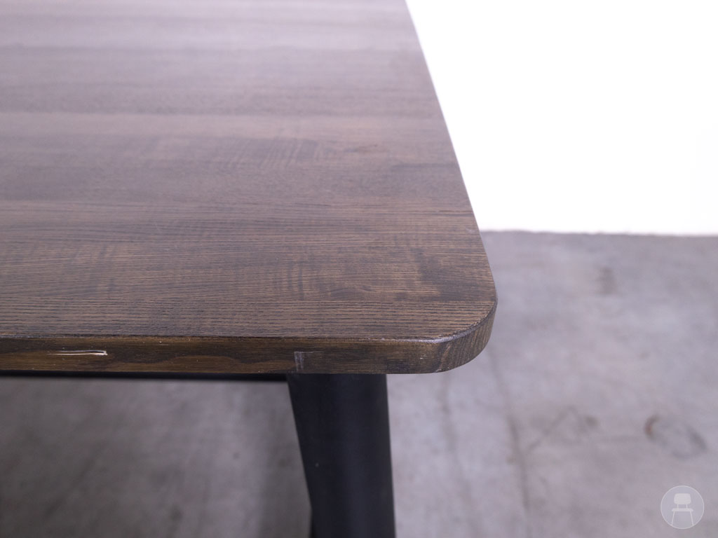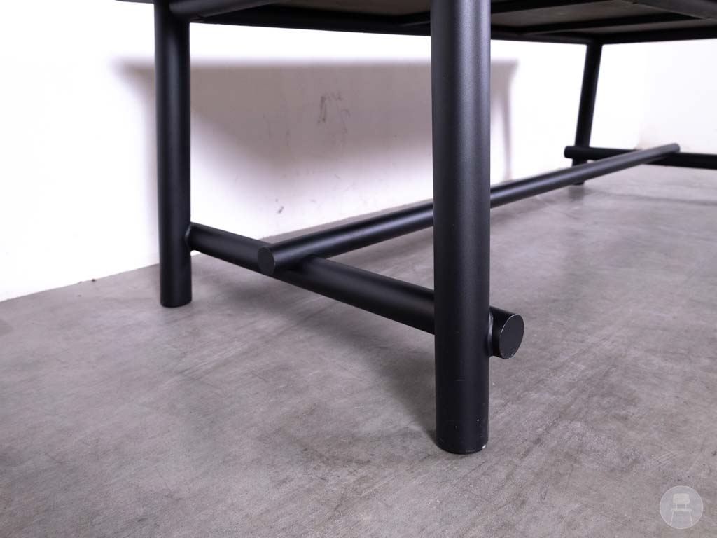 Het stevige aluminium onderstel in mikado-stijl biedt niet alleen stabiliteit, maar geeft de tafel ook een moderne twist. Ondanks één lichte beschadiging aan de rand (zie foto), verkeert deze tweedehands stamtafel van Satelliet in goede staat en is hij direct inzetbaar in bijvoorbeeld restaurants, brasseries of vergaderruimtes. Een stijlvolle combinatie van robuustheid, comfort en design.