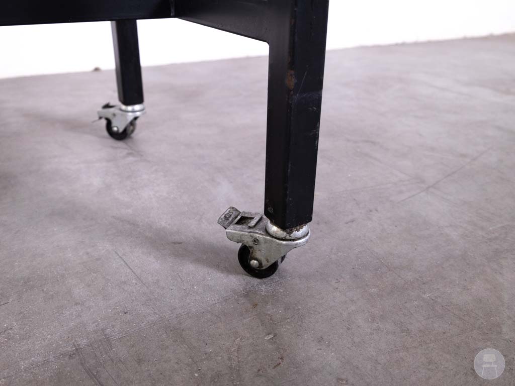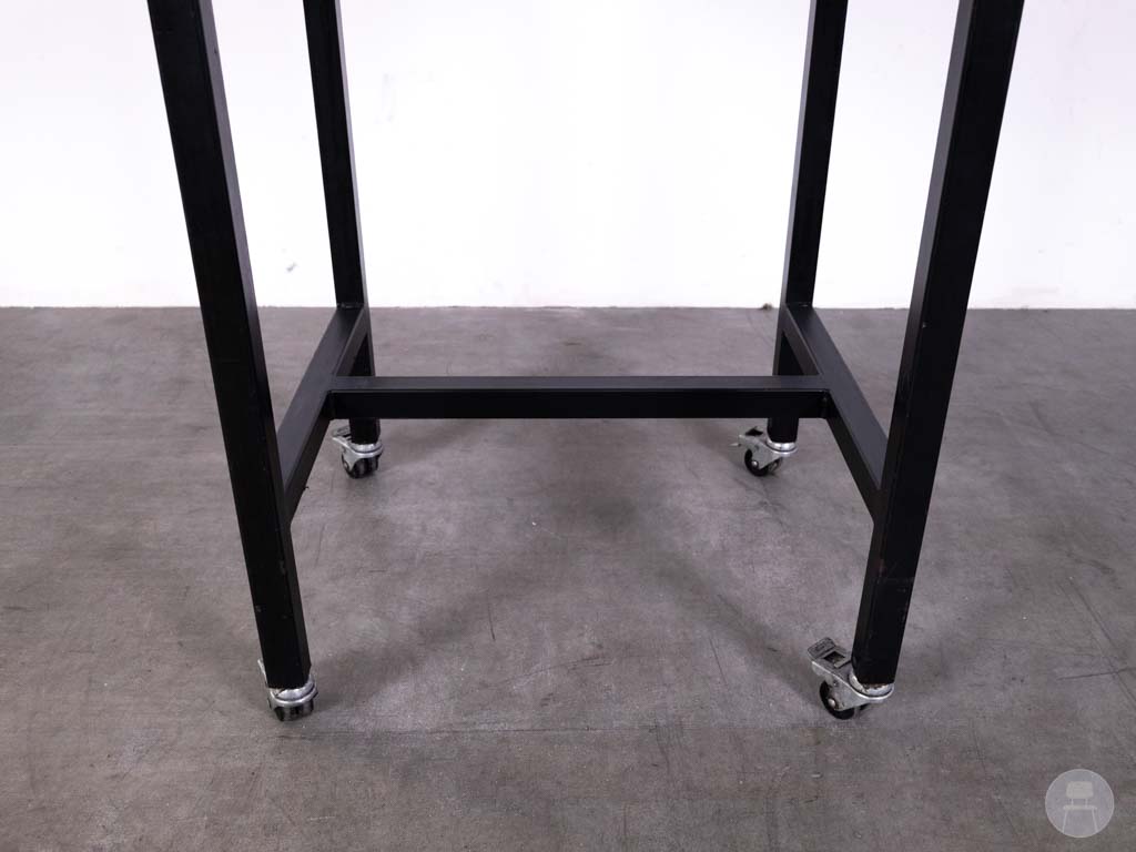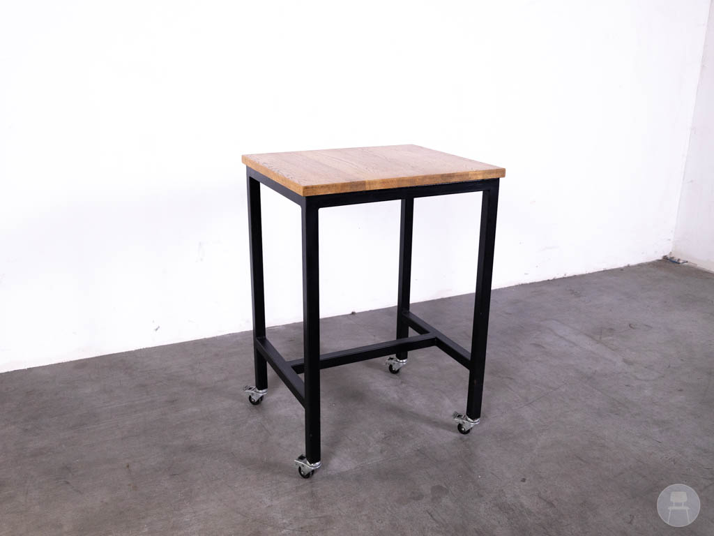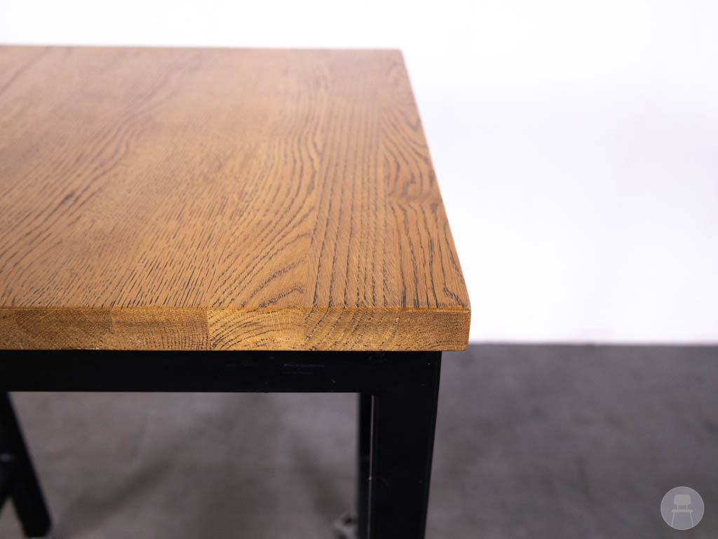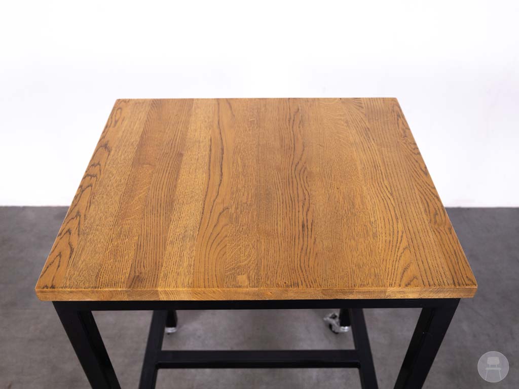 Het warme eikenhouten blad geeft een natuurlijke en uitnodigende uitstraling, terwijl het zwarte stalen onderstel zorgt voor stabiliteit en een industriële look. De combinatie van mobiliteit en robuustheid maakt deze tweedehands statafel van Satelliet een bijzonder praktische keuze voor ondernemers die houden van flexibiliteit zonder concessies te doen aan stijl en kwaliteit.